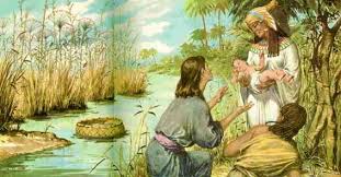 A filha de Faraó se banhava no Nilo e achou a criança chorando, mandou que pegassem o menino. A irmã do menino vendo tudo, perguntou a filha de Faraó: Quer que eu chame uma hebréia para amamentar essa criança. Ela respondeu: Sim.